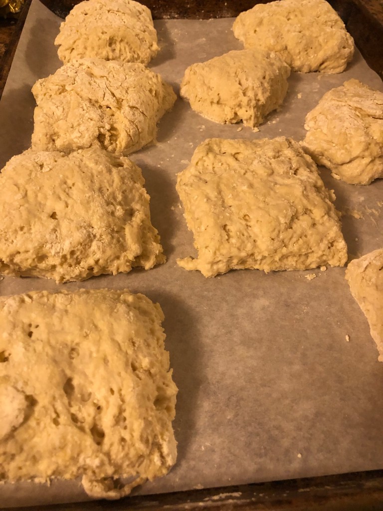 Using a biscuit cutter or knife, cut biscuits and place on a well greased or parchment lined baking sheet.