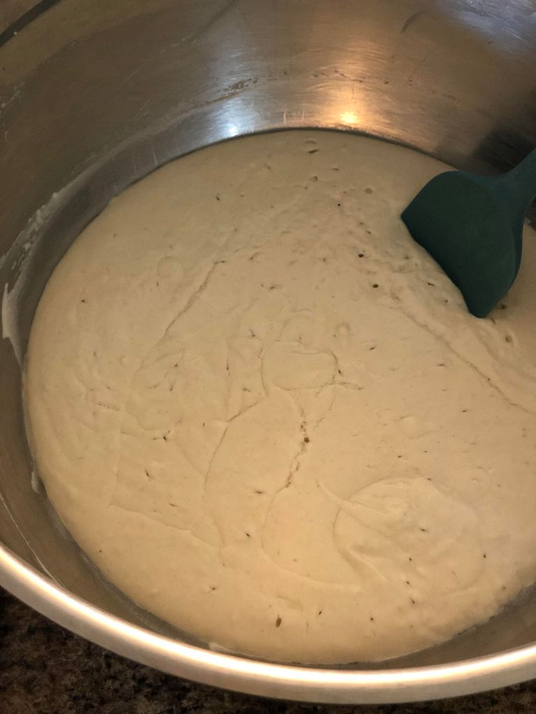 The night before you’re going to make your biscuits, mix your discard starter, 2 1/4 cups plant-based milk, 1/2 cup of grated frozen buttery sticks, 1 Tbsp organic sugar, and 1/2 tsp apple cider vinegar. Mix it with a whisk until the starter breaks up (some small chunks are okay). Then add 2 cups all purpose flour and whisk to remove any lumps. Cover your bowl and let it sit out overnight. In the morning, it should look like this: