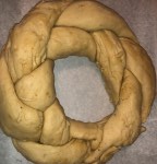 Divide dough into 3 equal parts. Roll each into approximately an 18 inch rope on a lightly floured surface. Braid the ropes and fashion the braid into a circular loaf on the parchment lined baking sheet.